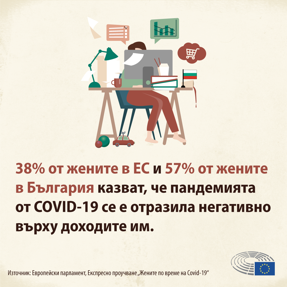 Не на последно място, поради пандемията 21% от жените обмислят или са решили да намалят трайно времето, което отделят за извършване на платена трудова дейност. В България 22% от жените са на това мнение.