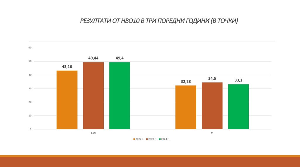 По математика средният резултат е 33,1 точки при 34,5 през учебната 2022/2023 г. Учениците са се справили с практическите задачи, свързани с път, скорост, време, но имат затруднения със задачите, които са свързани с финансовата грамотност и изчисляването на лихва.
