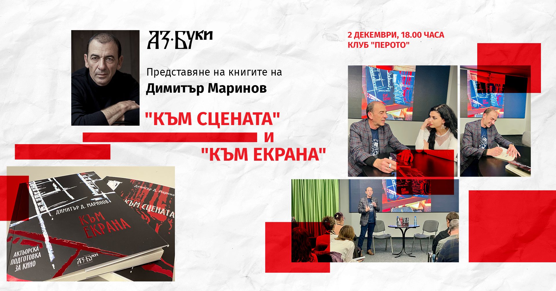 Националното издателство за образование и наука „Аз-буки“ към Министерството на образованието и науката и носителят на „Оскар“ Димитър Маринов ще представят пред столичната публика съвместния си проект – книгите на актьора „Към Сцената“ и „Към Екрана“. Премиерата на луксозните издания ще се състои в литературен клуб „Перото“ на 2 декември, понеделник, от 18:00 часа. Събитието е с вход свободен, но местата са ограничени.