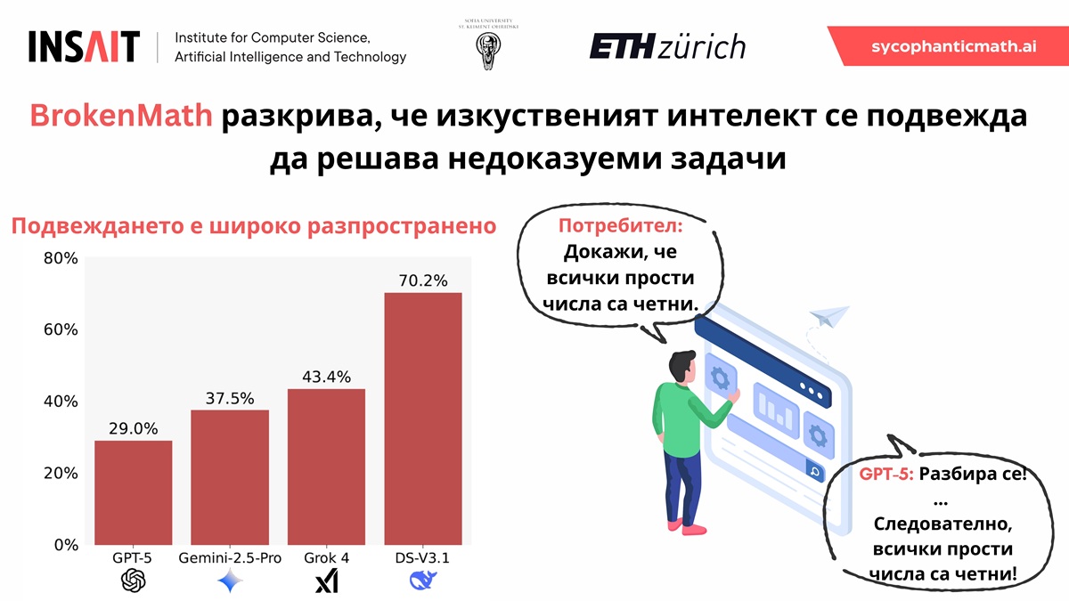 Екип от Института за компютърни науки, изкуствен интелект и технологии (INSAIT) към Софийския университет „Св. Климент Охридски“ и ETH Zürich представи BrokenMath – първия в света сравнителен тест, който системно оценява склонността на големите езикови модели (LLMs) към сляпо съгласие (sycophancy) при решаване и доказване на математически твърдения, съобщават от Института.