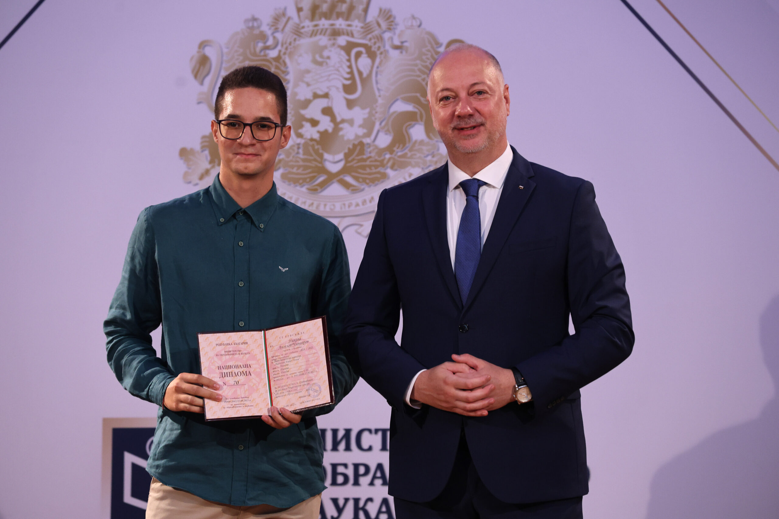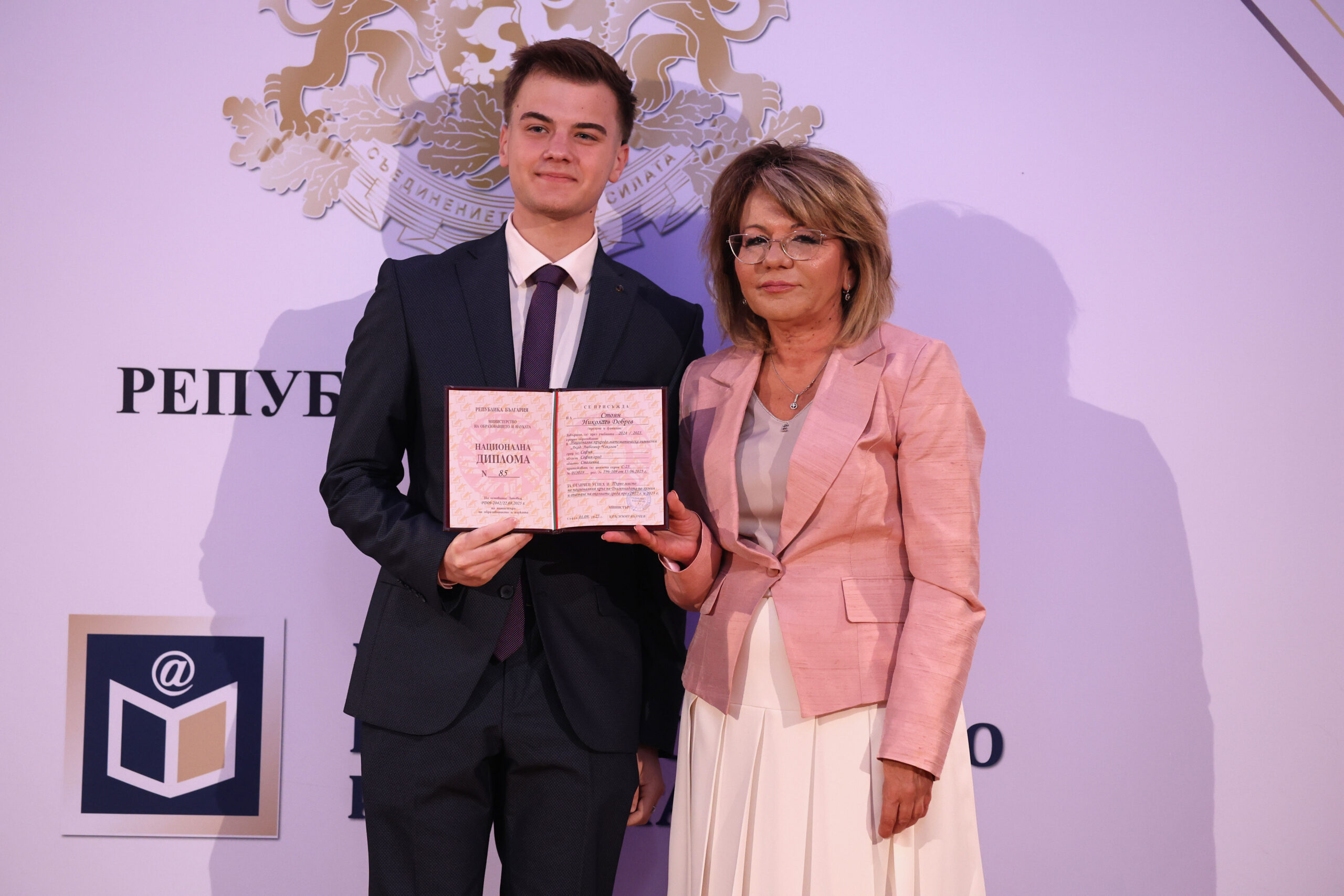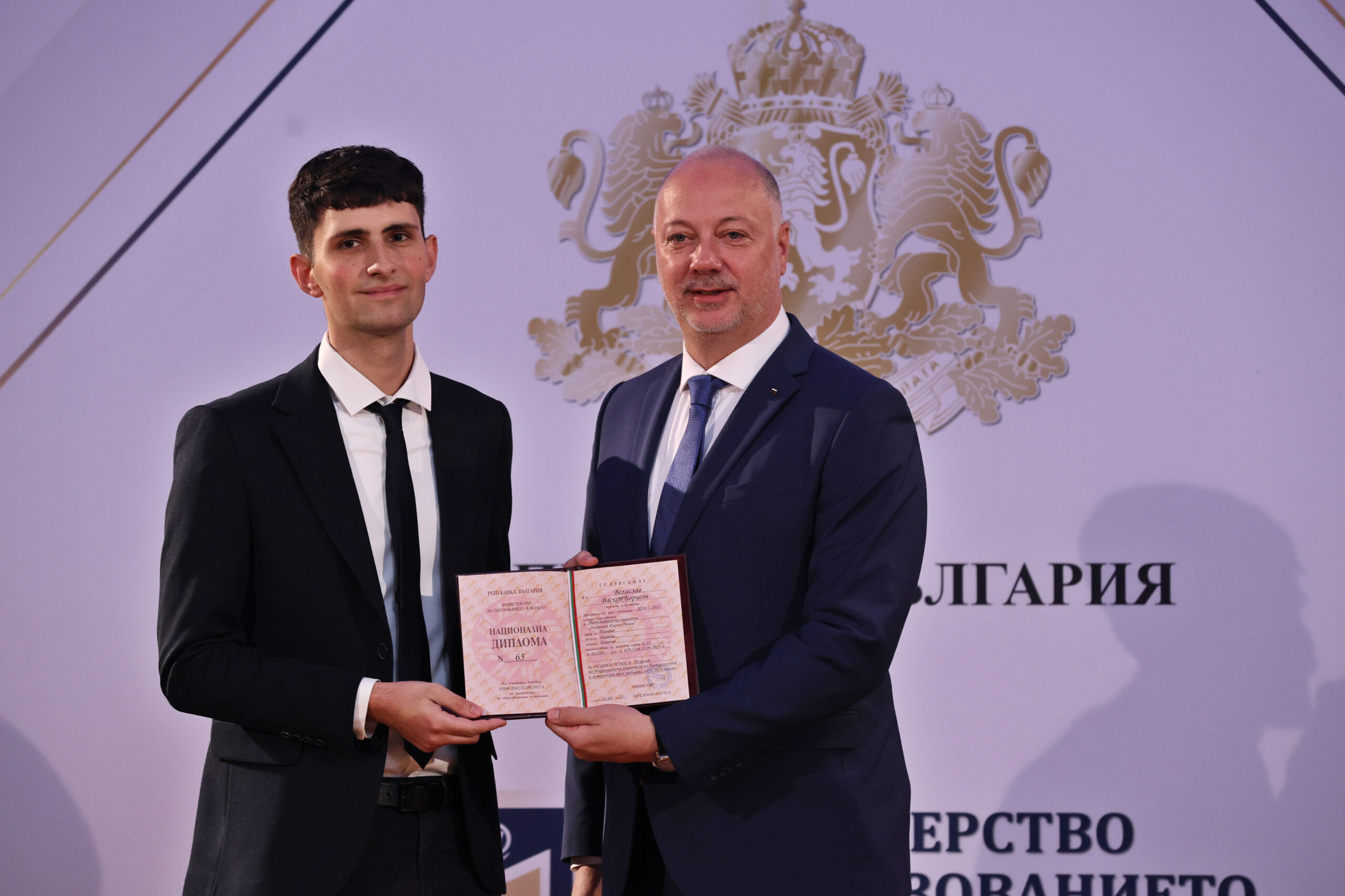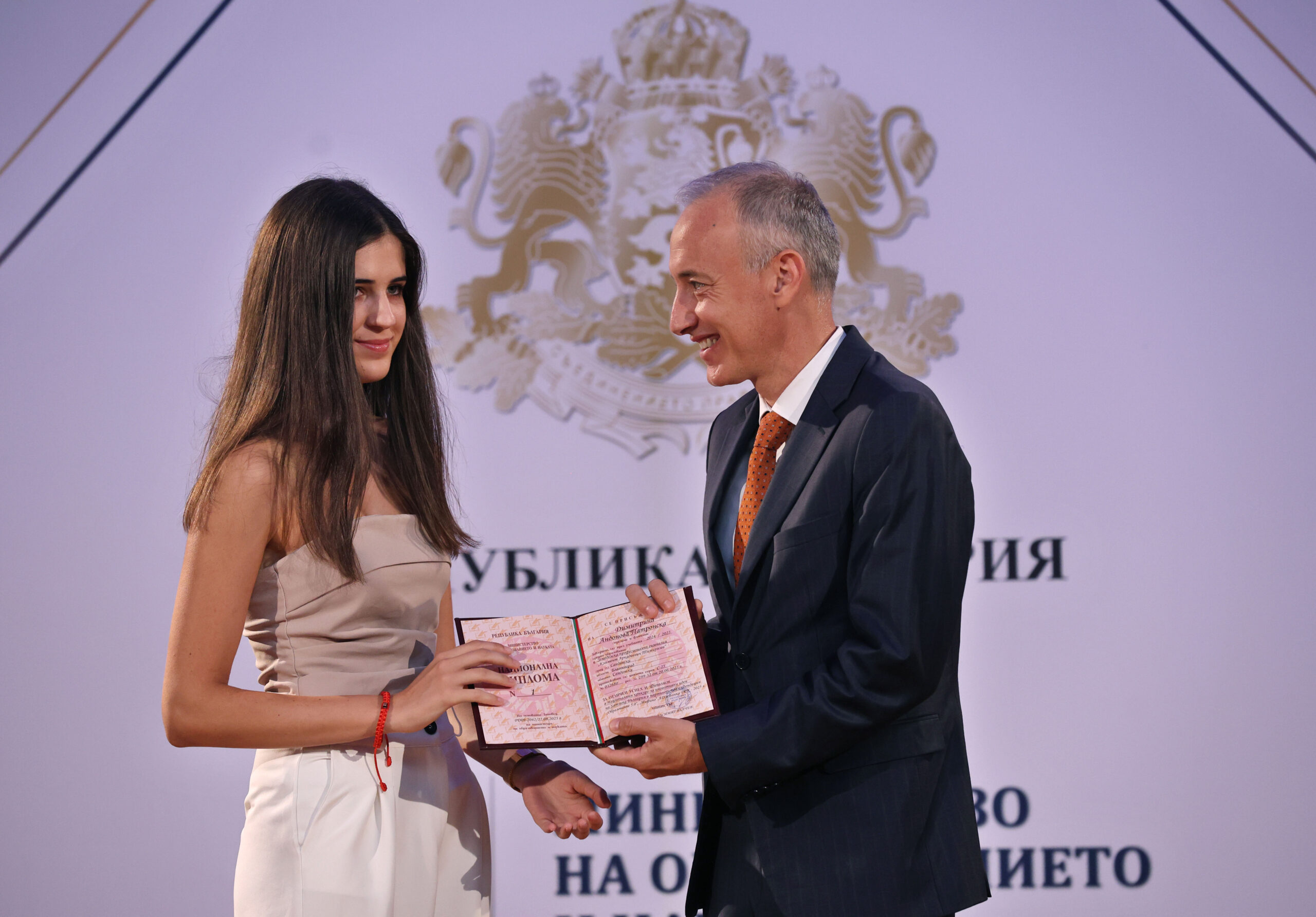 „За мен една от най-добрите новини по време на годишните връчвания на националните дипломи е, че все по-често тези млади хора избират да продължат обучението си в България“, отбеляза министър Красимир Вълчев. Той поздрави лауреатите за упорития труд през всичките години на гимназиалното си обучение.