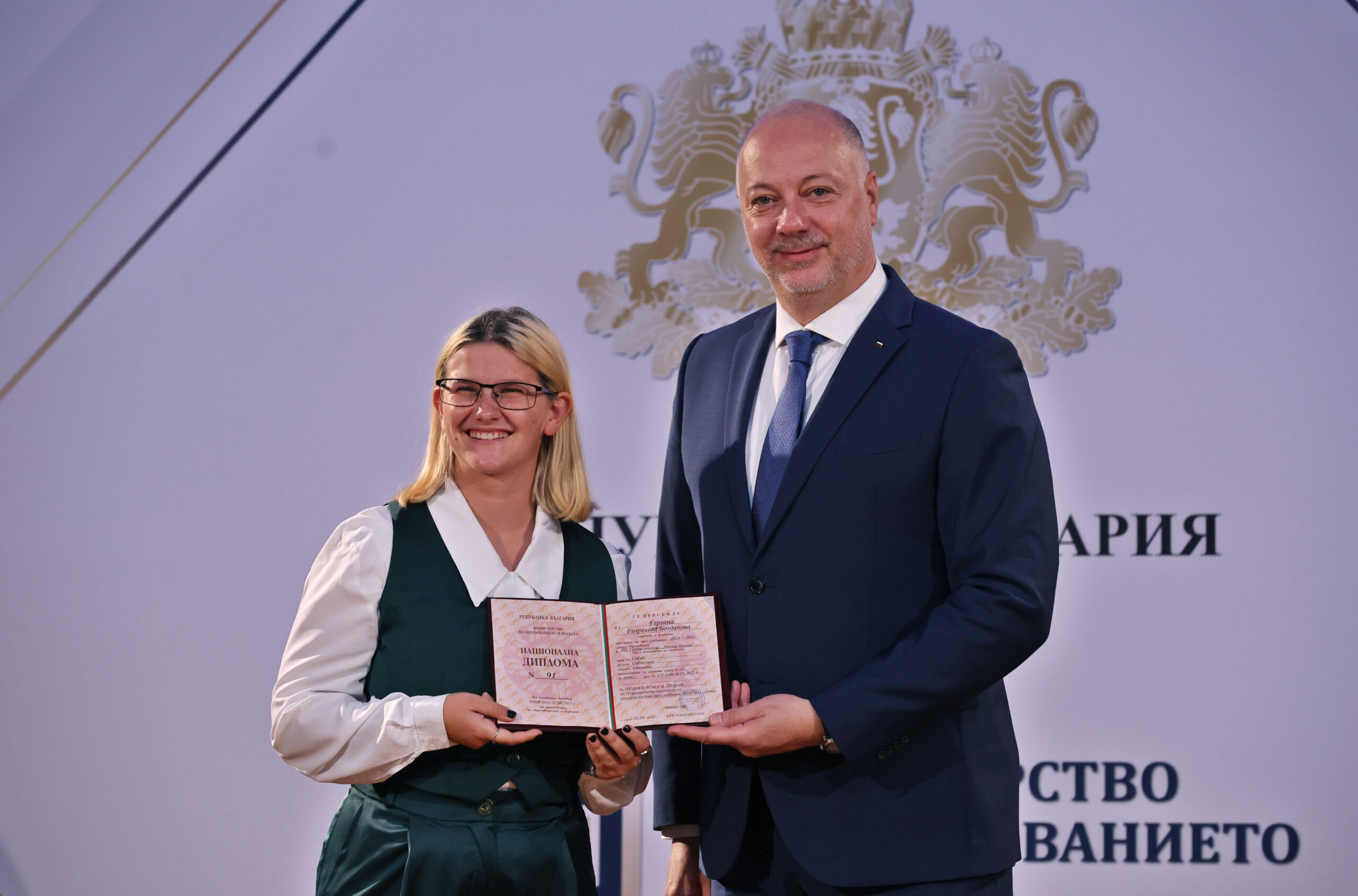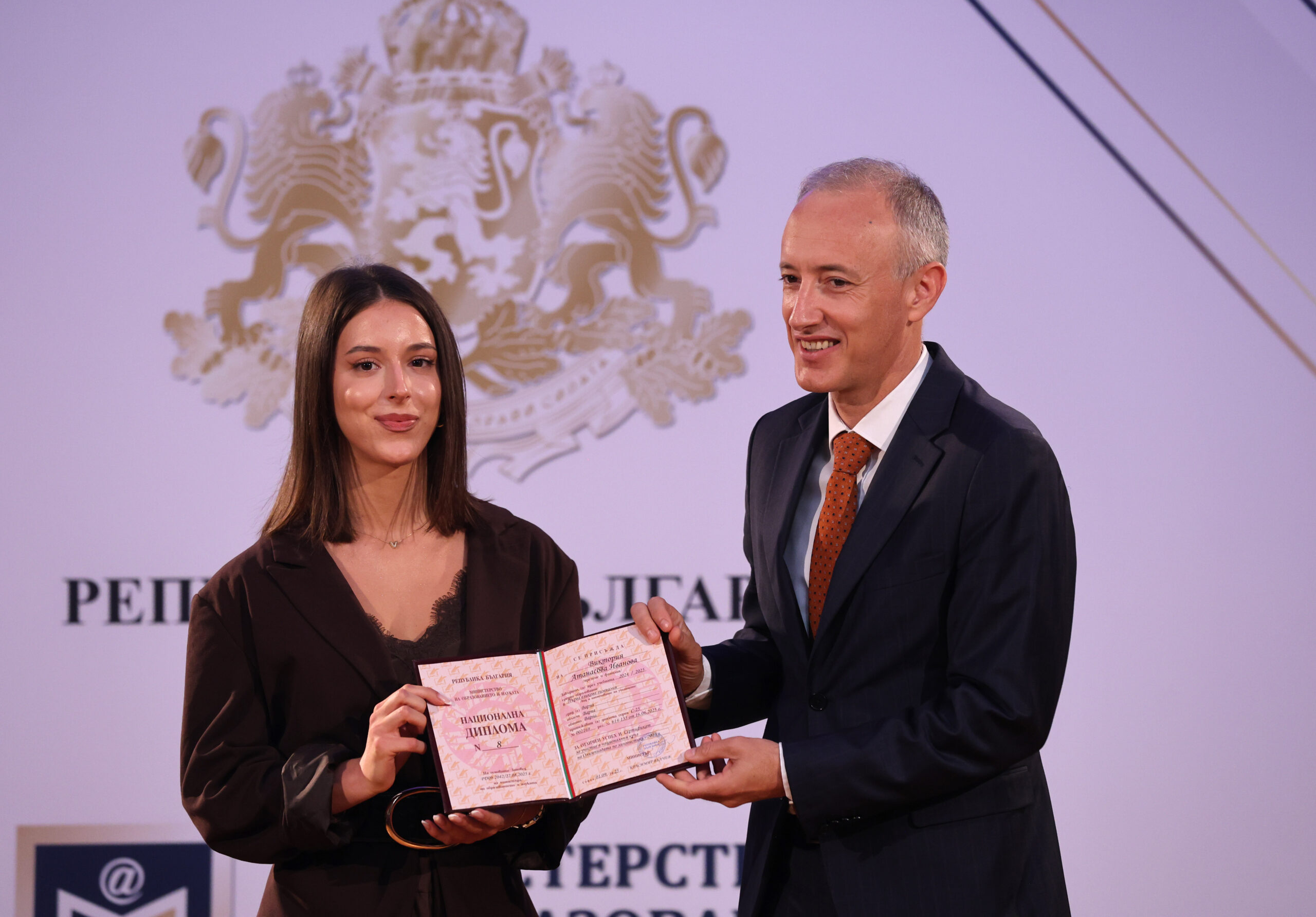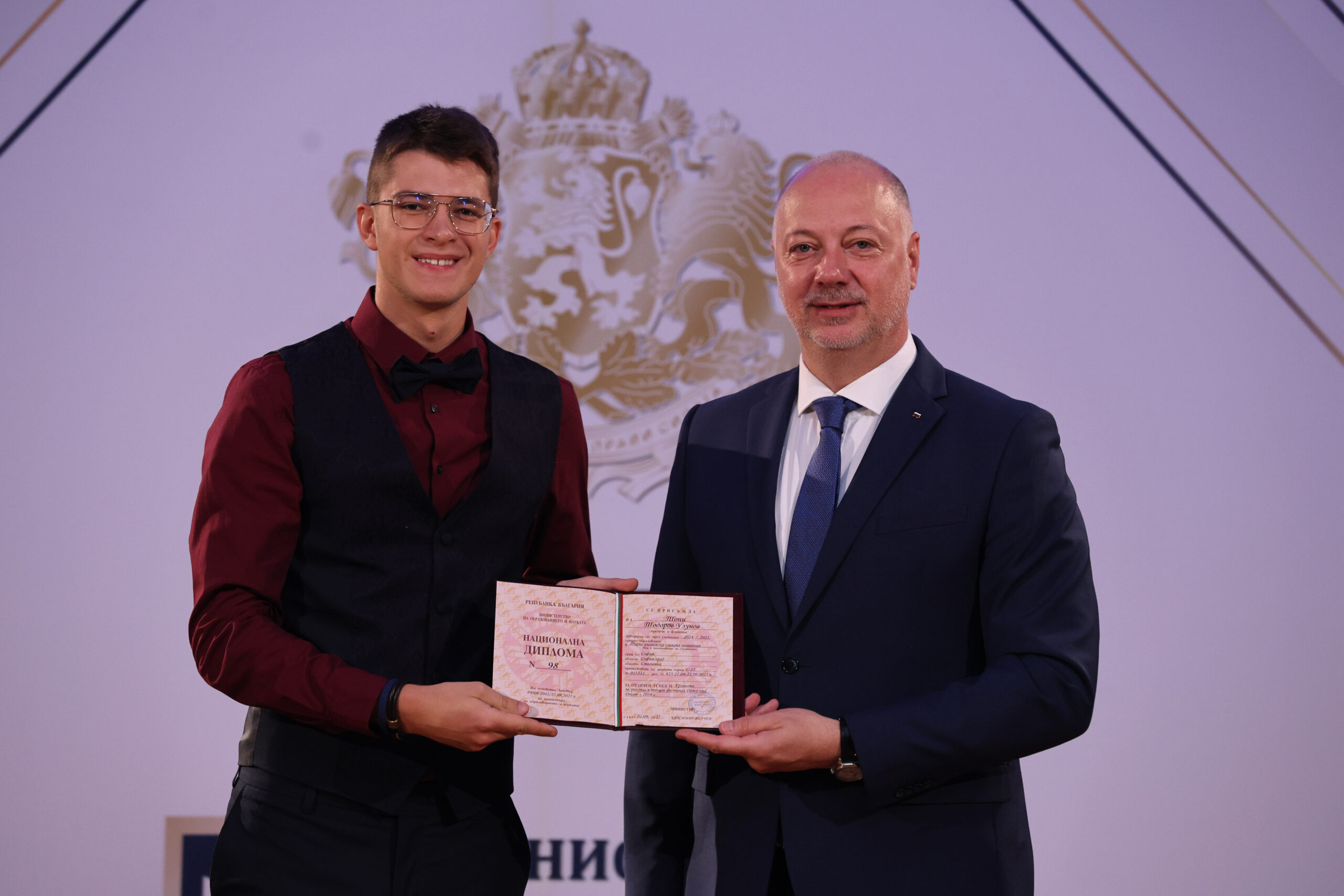 „За мен една от най-добрите новини по време на годишните връчвания на националните дипломи е, че все по-често тези млади хора избират да продължат обучението си в България“, отбеляза министър Красимир Вълчев. Той поздрави лауреатите за упорития труд през всичките години на гимназиалното си обучение.