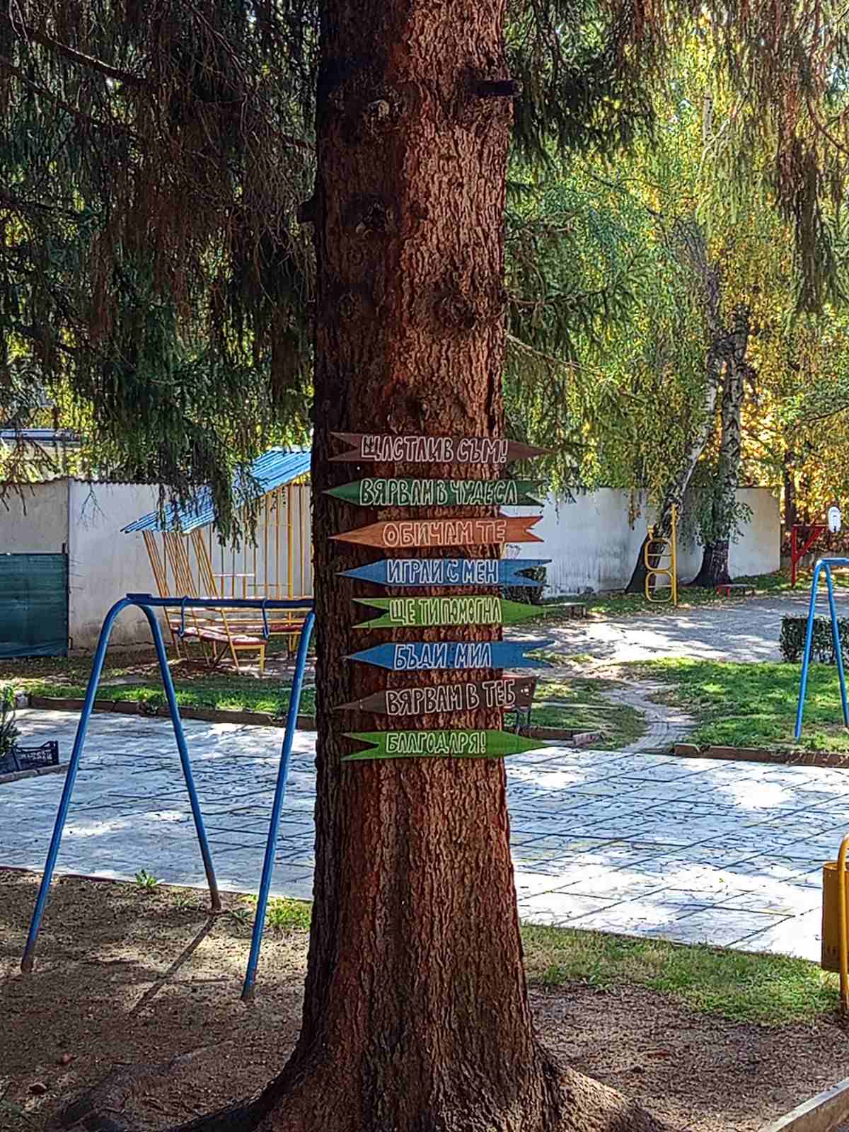 А на едно от дърветата върху плоскости са изписани най-хубавите думи – щастлив съм, вярвам в чудеса, обичам те, играй с мен, ще ти помогна, бъди мил, вярвам в теб, благодаря.