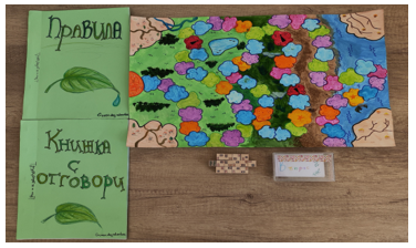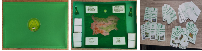 Green day adventure с игрално поле, пулове, правила, книжка с въпроси и книжка с отговори. Предимствата на играта пред другите настолни игри на пазара са: иновативна, задълбочава знанията на участниците за природните науки и зелените технологии, изгражда екологично мислене и поведение в играещите, атрактивен и креативен дизайн (фиг. 1.).