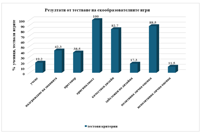 Данните показват, че учениците препоръчват създадените екообразователни игри да се използват основно за надграждане и разширяване на екологичните знания (42.3%), за обобщение и преговор на придобитите знания (38.5%) и за учене (19.2%). Учениците оценители смятат, че игрите се отличават с оригинални концепции за екологичност и игрови механизми (100%) и са качествени, авторски, дизайнерски продукти (82.7%). Голяма част от участниците, тествали игрите, ги оценяват като забавни и интересни, играли са с удоволствие, чувствали са се добре и са се справили добре (88.5%). Само (11.5%) от участниците смятат, че игрите са скучни, безинтересни, създали са им дискомфорт и не са се справили добре (фиг. 9.).