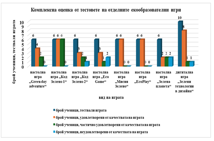 - Комплексна оценка за всяка тествана игра и комплексна оценка за всички тествани игри (ученици, удовлетворени от качествата на играта / частично удовлетворени от качествата на играта / неудовлетворени от качествата на играта).