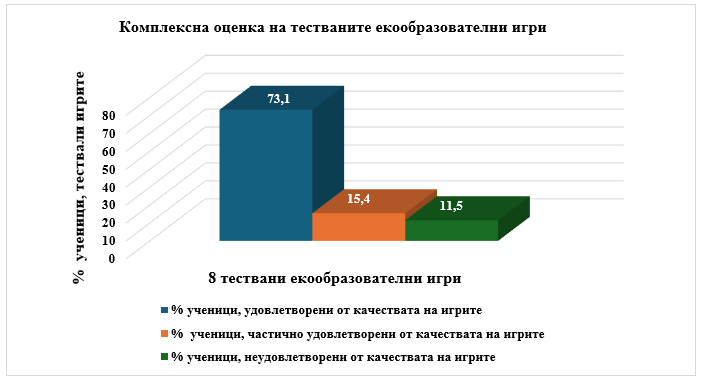 Тестовете показват най-голямо одобрение за настолните игри „Код Зелено 1“, „Мисия Зелено“, EcoPlay и за дигиталната игра „Зелени технологии в дизайна“ (фиг. 10.). Значителна част от учениците (73%) са напълно удовлетворени от качествата на екообразователните игри, около 15% от учениците са частично удовлетворени от качествата на игрите и около 11% не са удовлетворени от качествата на тестваните от тях игри (фиг. 11.).