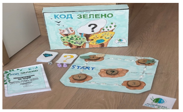 „Код Зелено 1“ в брандирана кутия с игрално поле, карти с въпроси и отговори, зар, дървени пулове, инструкция и собствено лого. Играта съчетава обучение със забавление и изгражда екологично отговорно поведение чрез споделяне на дейностите и емоционалното взаимодействие на играещите (фиг. 2.).