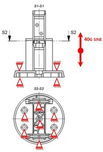 The model is constrained as it is shown on Figure 4 b). Vertical direction is constrained on the both top down and top contact surfaces as to represent mounting to the armature. Sine profile from 100Hz to 5000Hz at 40g was used for validation of the fixture – as it is used for experimental tests.