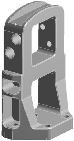 There is no need to simplify the fixture model geometry, as it is not overly complex and the 3D model is used as is for the analysis. Bolted connections to the armature are presented by imprints of bolts to the fixture and thus are not included in the model. Used for simulations geometry model is shown in Figure 3 b).
