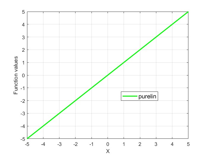 Figure 4. Activation function of the neuron: (а) Logistic Sigmoid (logsig); (b) Hyperbolic Tangent Sigmoid (tansig); (с) Linear transfer function (purelin)