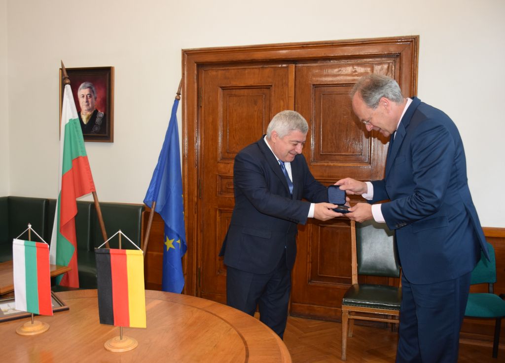 Н.Пр.Кристоф Айххорн се срещна с ректорското ръководство на Русенския университет. Проф. Христо Белоев представи международната дейност и приоритетите на Университета. Бяха обсъдени възможности за разширяване на сътрудничеството между висшето училище и немски образователни институции. Н.Пр. Айххорн