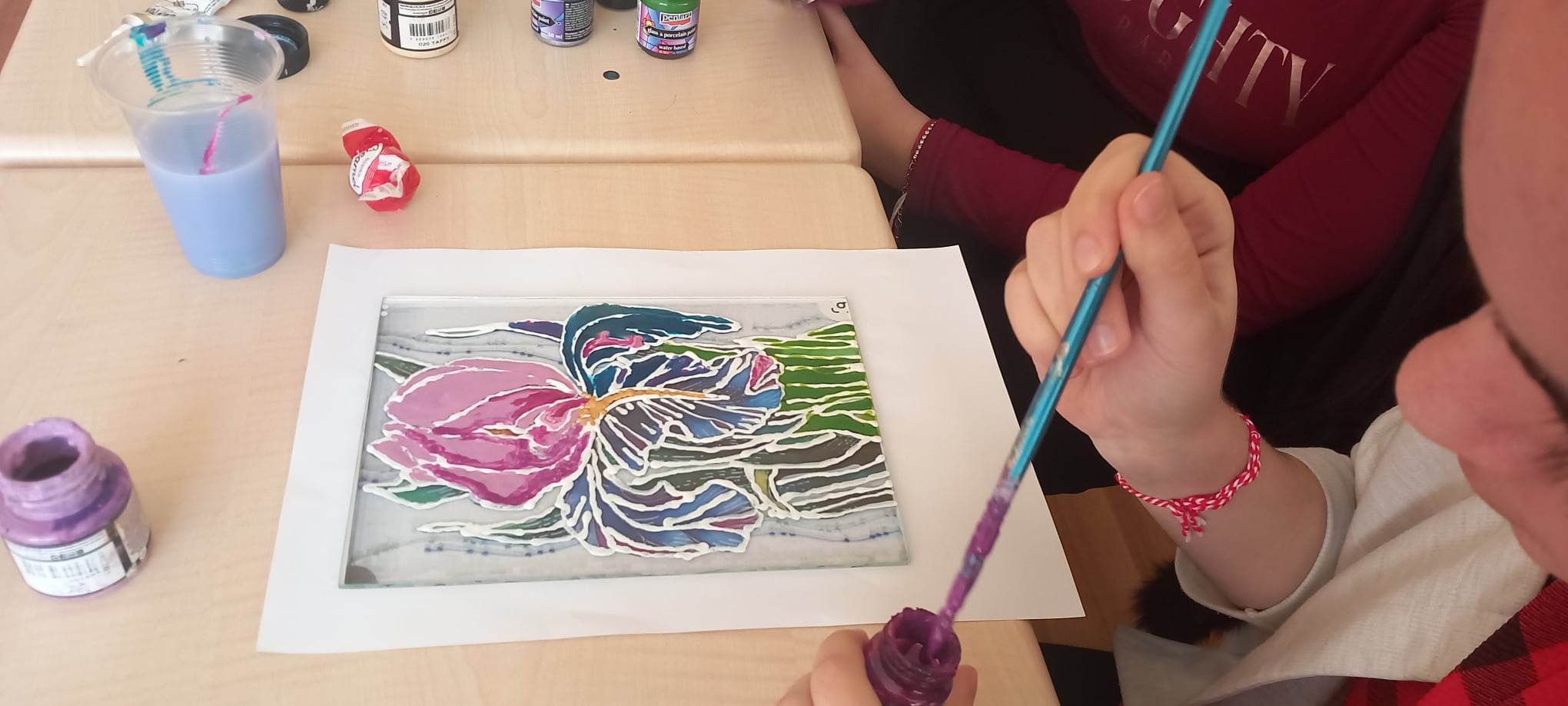 Всички участници в ателието твориха по предварително създаден готов проект. Цветовото решение и колоритът бяха оставени в ръцете на начинаещите творци. След запознаване с основните стъпки за направата на стъклопис учениците се потопиха във фееричното разнообразие на цветната гама и разгърнаха въображението си, рисувайки върху стъкло.