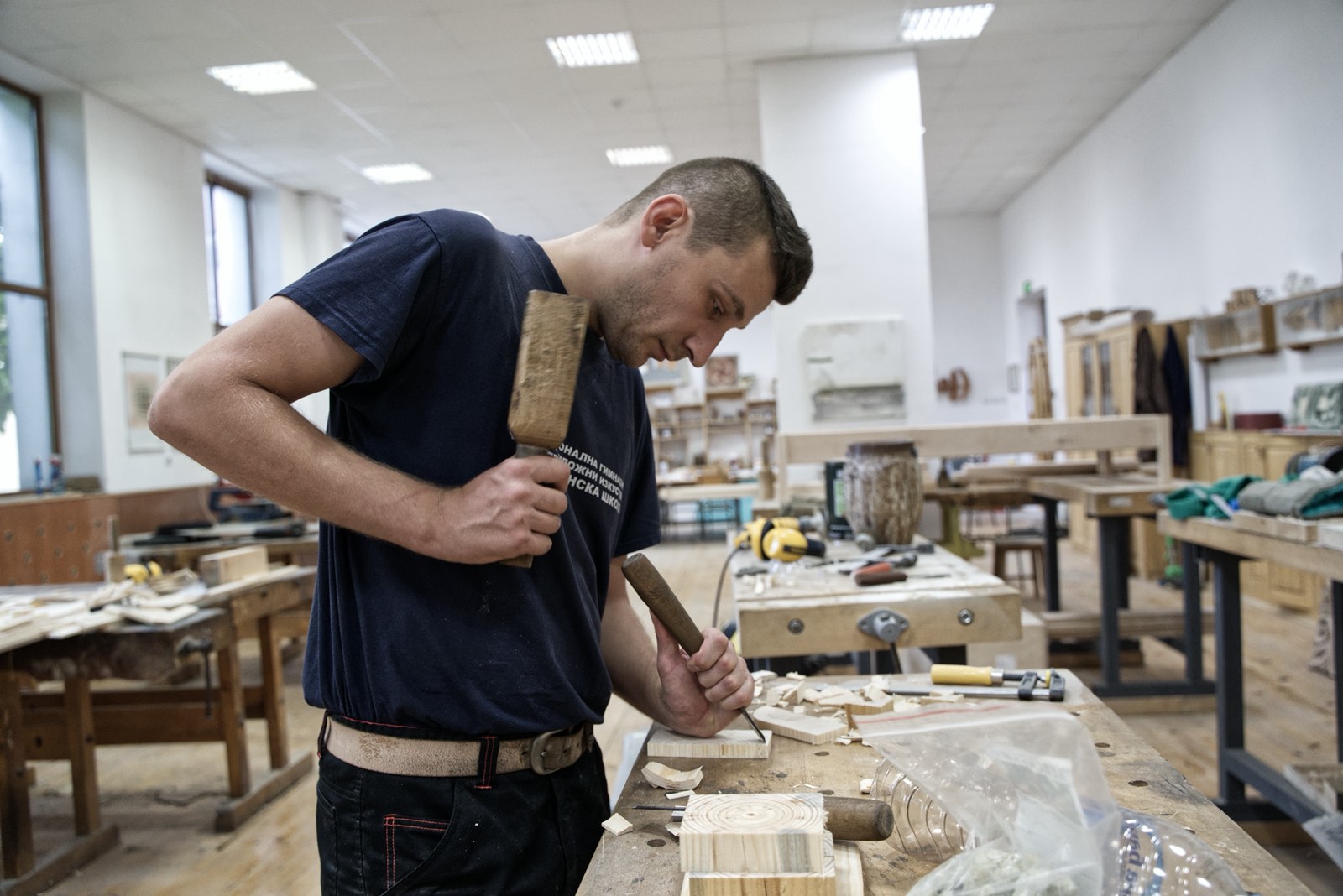 Но това е доста неудобно. Учениците ходят по петнадесет минути до основното училище за часове по общообразователни предмети, после се връщат в гимназията. За практическите занятия ги събират в голяма работилница и няколко странични ателиета, отделени от общежитието. За щастие, работилниците не са засегнати от пожара и в тях може да се водят практически упражнения. Двете изложбени зали също са съхранени, но ако продължава да не се прави нищо за покрива, експонатите ще бъдат застрашени.
