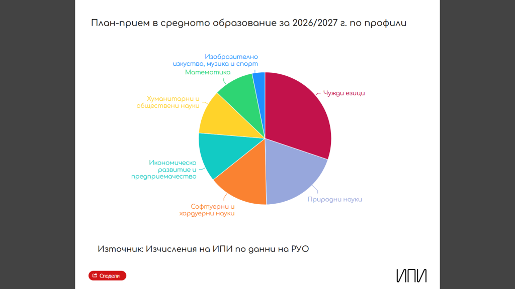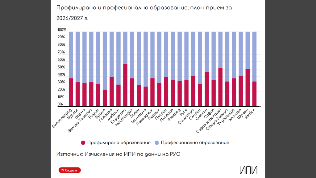 а най-нисък – във Враца (22,22%) и Монтана (26,26%). От една страна, това засилва проблема с несъответствието на професионалното образование с пазара на труда, а от друга – прави разпределението на профилите в профилираното образование още по-важно, смятат от ИПИ.