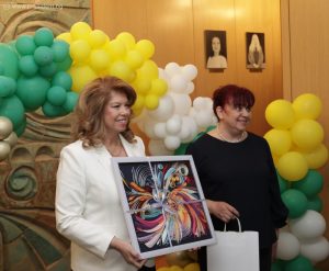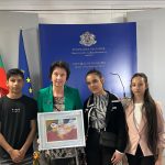 Директорът на средното училище подари на президента Йотова картината „Светлина и криле“, която е дело на преподавателя от СУ „Петко Рачов Славейков“ Лидия Богомилова и е изработена с техниката „квилинг“.