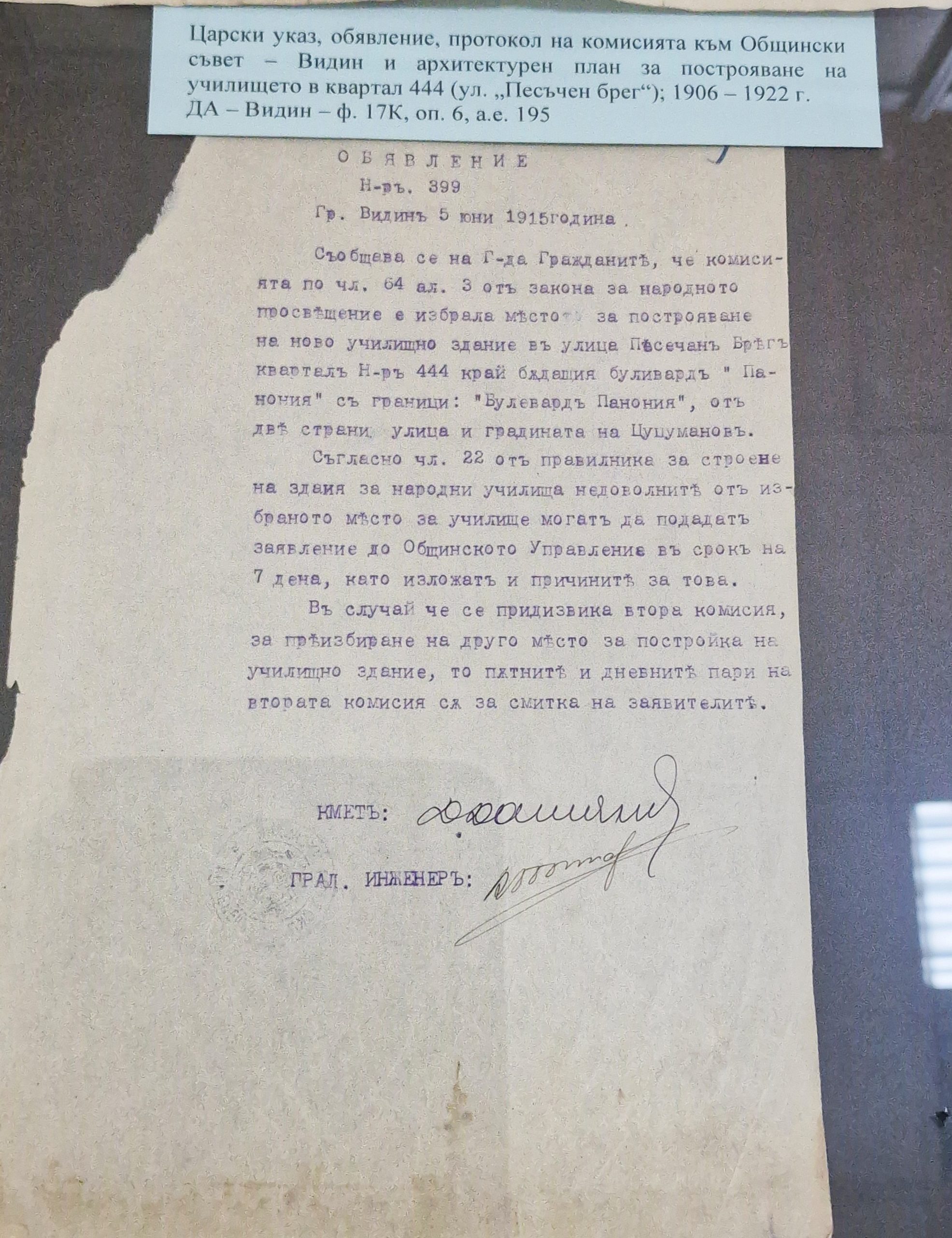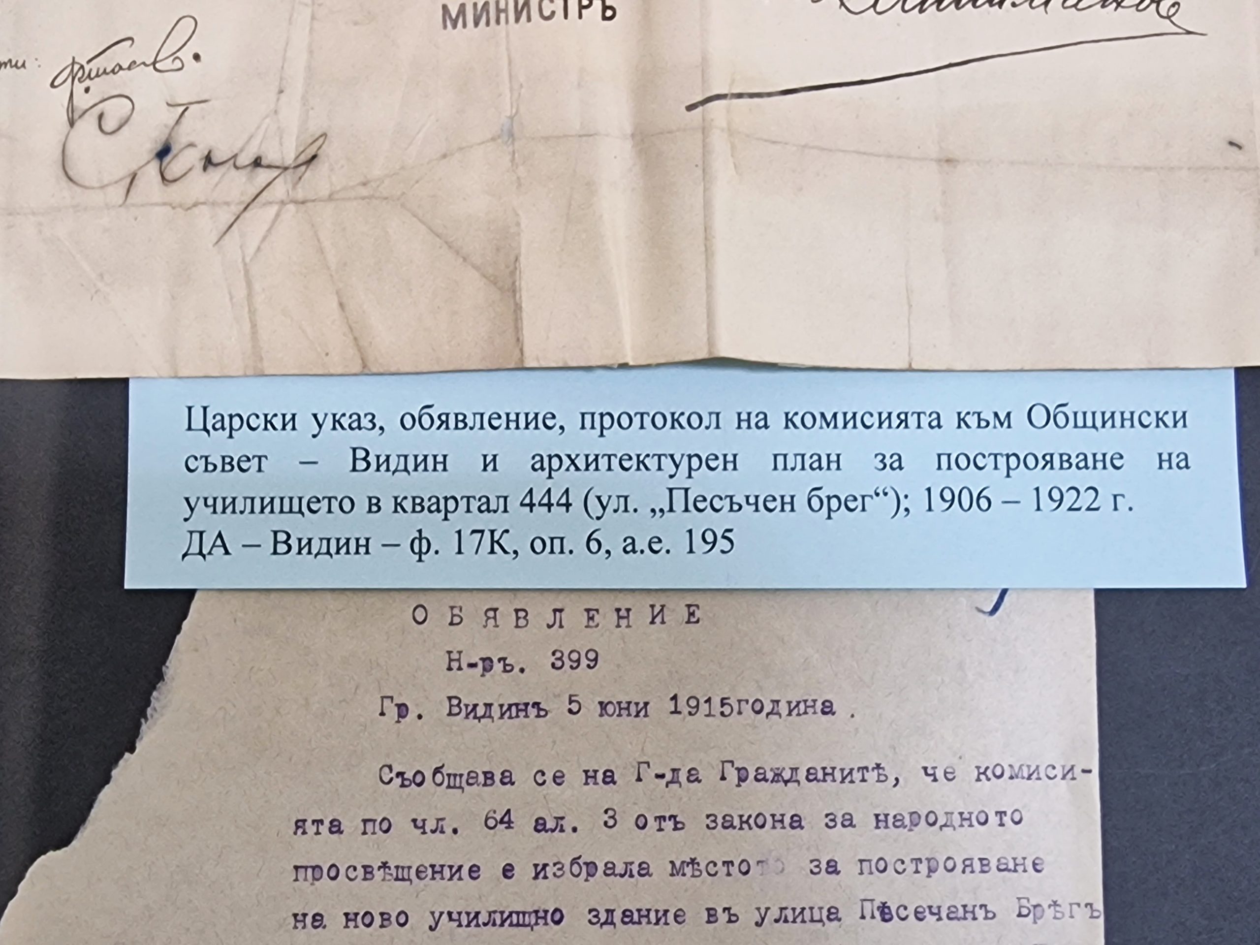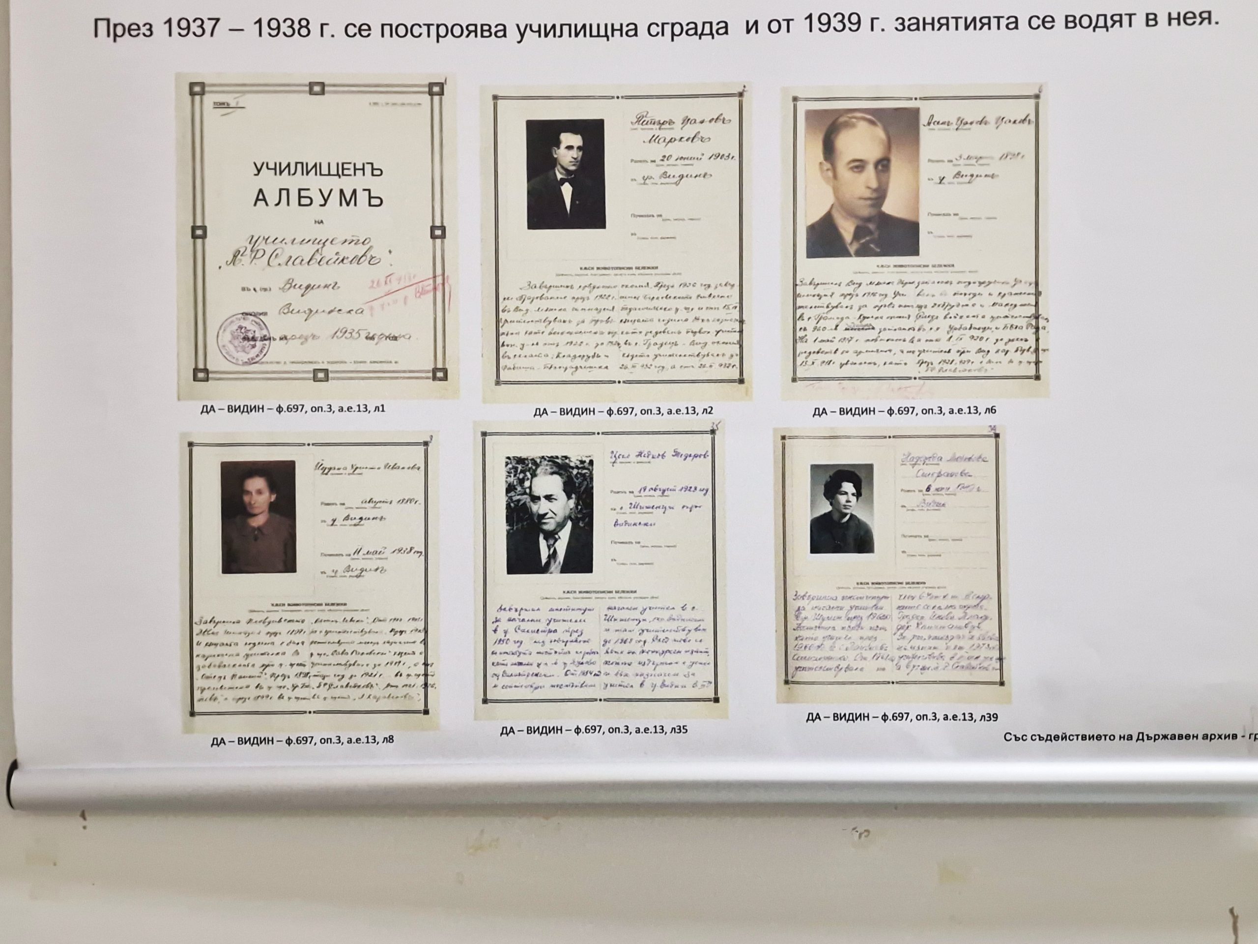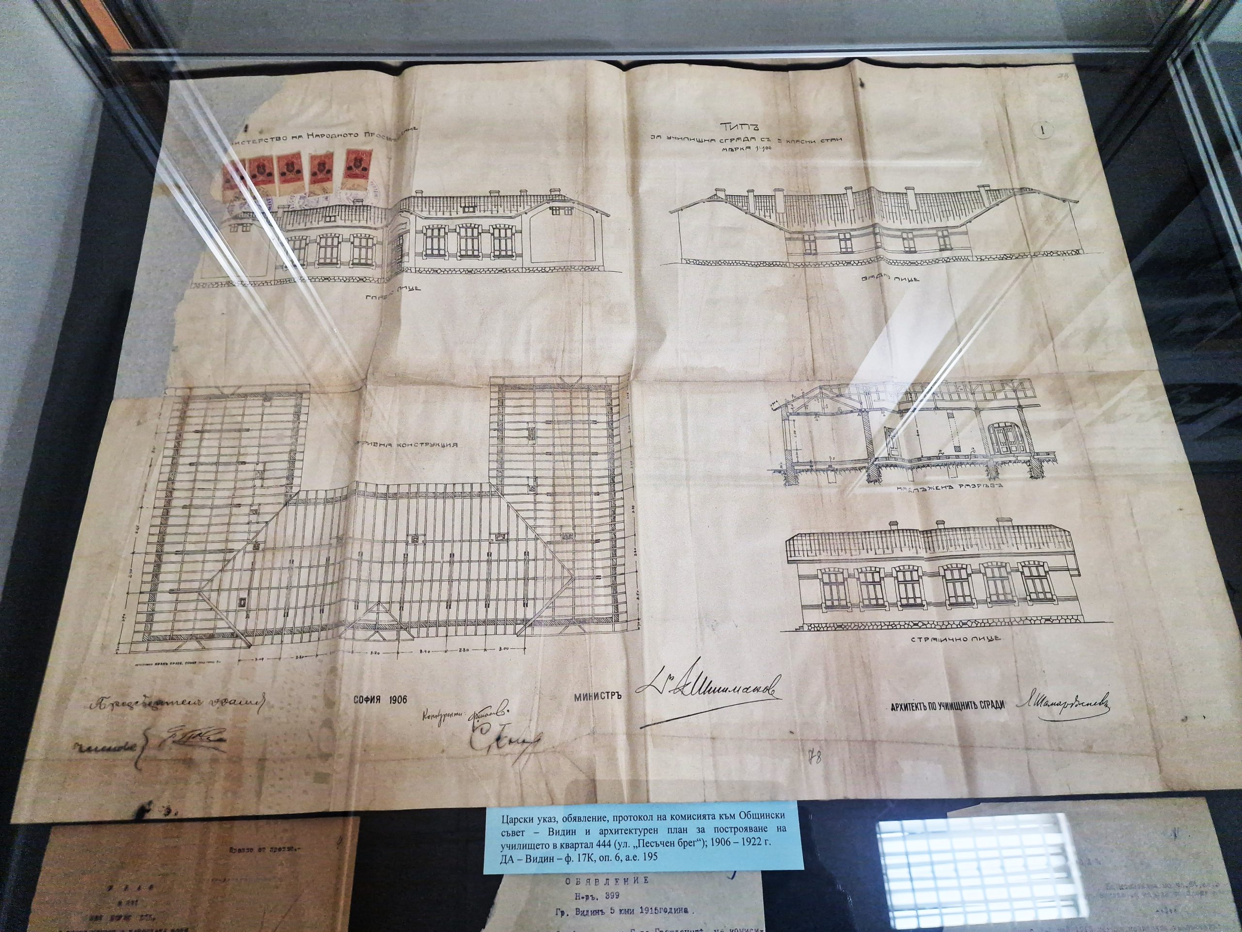 Във витрините могат да се видят документи, разказващи за първите години на училището – царски указ за неговото създаване, обявление и протокол на комисията към Общинския съвет – Видин, и архитектурен план за построяване на Началното училище „Петко Рачов Славейков“ в квартал на ул. „Песъчен брег“ са част от експонатите. Интерес представляват и други документи и снимки, свързани с построяването на първата сграда на училището, както и страници от училищен албум със снимки и информация за първите учители.