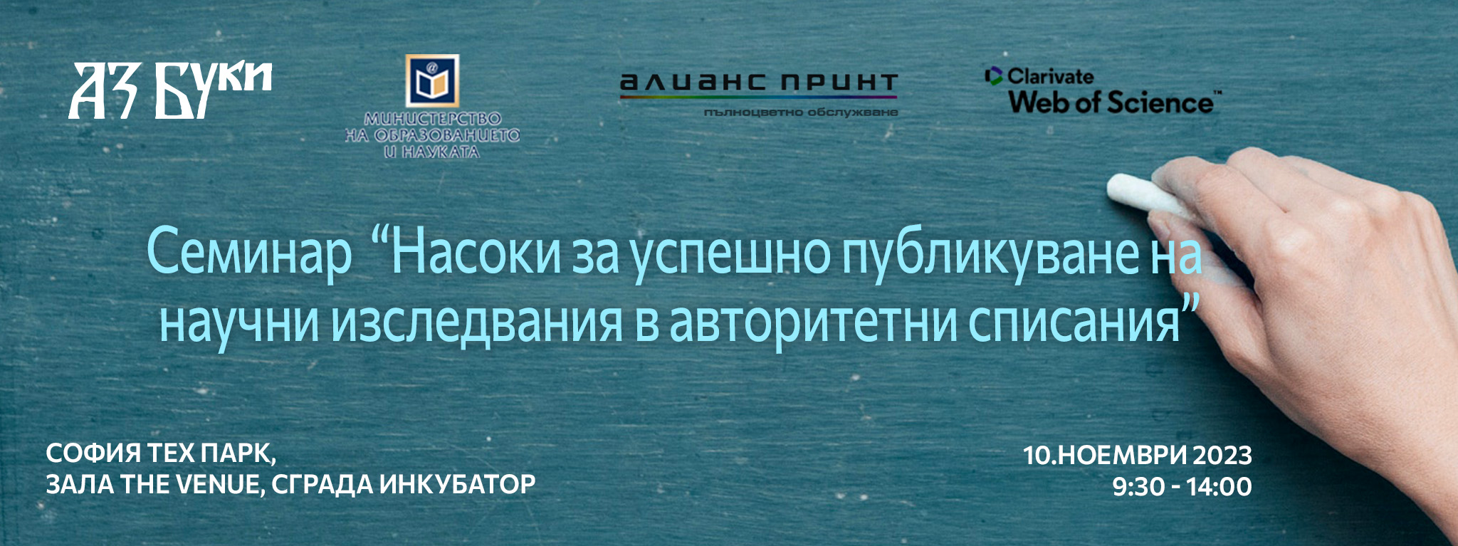 Заповядайте на първия по рода си семинар в България, организиран от Национално издателство за образование и наука „Аз-Буки“ и Представителство на „Кларивейт Аналитикс“ за България, който ще ви даде практически насоки за успешно публикуване на научни изследвания в авторитетни издания както в България, така и по целия свят.