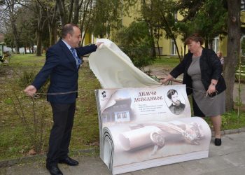 Директорът на училището Анелия Генова и кметът на община Белене Милен Дулев откриват книгата пейка на Димчо Дебелянов. Снимка – ...