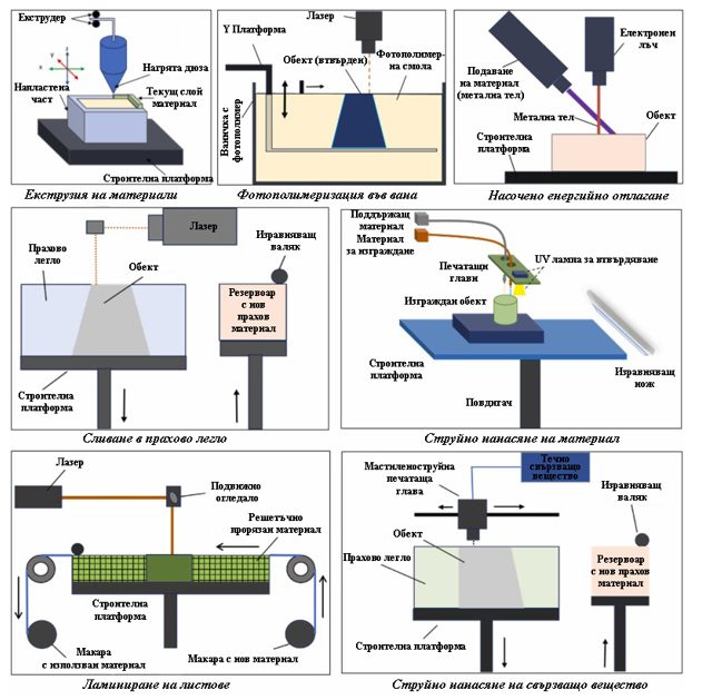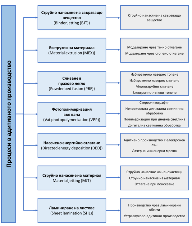 Съгласно комитет „F42 Адитивно производство“ на Американското дружество за изпитване и материали (American Society for Testing and Materials, ASTM) в стандарт БДС EN ISO/ASTM 52900 са определени 7 категории на процеси в АП и техни разновидности, показани на фигура 1 (Wakjira et al., 2021).