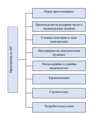 На фиг. 3 са показани приложенията на АП. Една от първите и най-широко разпространени области на приложение на адитивното производство е бързото прототипиране. Чрез него инженерите могат за кратко време да създават физически модели на нови изделия, което улеснява процеса на проектиране, визуализация и тяхното тестване. Това значително съкращава времето за разработка на нови продукти и позволява по-бързото им излизане на пазара.